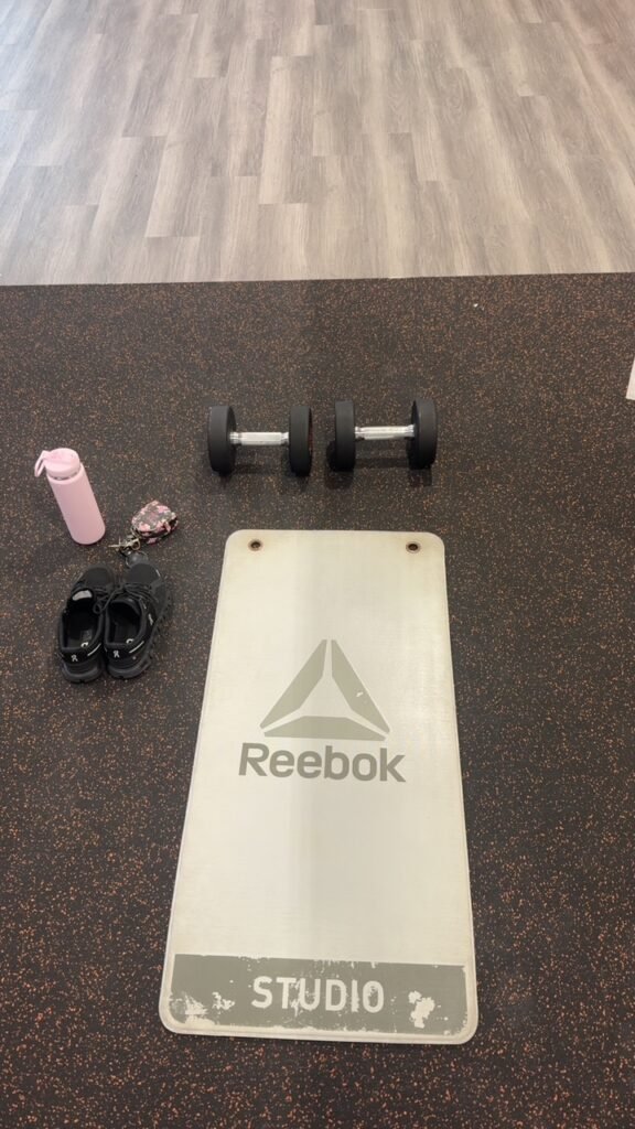 Core Workout (Mat)- Core workouts on the mat have really helped me tone my belly. As you can see in the picture, I use a weight to keep my feet in place during sit-ups. I also love doing planks and crunches. Simple but super effective for core strength and definition.